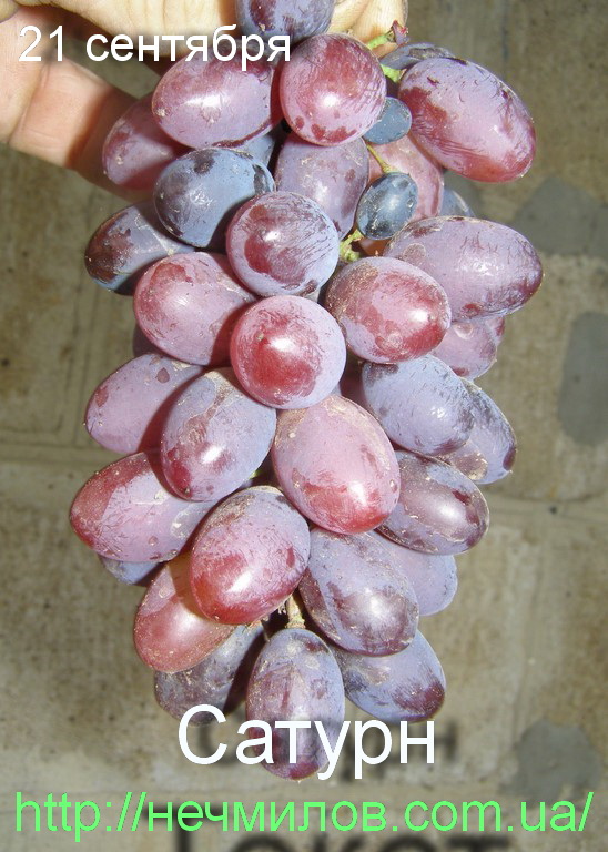(Дунстан 210 x NY 45791). Среднего срока созревания. Кусты слабо- или среднерослые. Грозди средние и крупные, весом 250-350 г, средней плотности, конические, иногда с плечом. Ягоды средние, красные, продолговатые, весом 3 г. Мякоть хорошего вкуса, сахаристость 20 %. Кожица не отделяется от мякоти, в ягодах присутствуют рудименты семян, не ощущаемые при еде. Склонен к перегрузке, требуется прореживание гроздей. Лоза вызревает хорошо. Урожайность средняя и выше средней. Ягоды восприимчивы к растрескиванию, если в период созревания стоит влажная погода. Сорт винограда Сатурн повышенно устойчив к морозам (-23°С) и грибным заболеваниям. Сатурн оставался свежим 12 недель. Виноград используется в свежем виде, а также для производства купажных вин. Достойный сорт бессемянного винограда для приусадебного виноградарства.