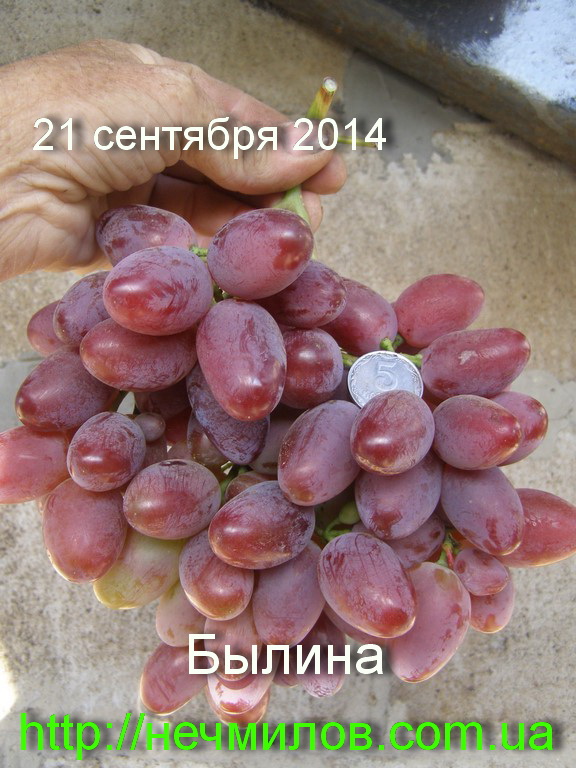 2013 год. Просматриваю записи за несколько лет и нет ни единого раза, чтобы на нем был нормальный урожай. Единственное радует, что даже в прошлый экстремальный год, он не поменял своего статуса, те же контрольные небольшие две гроздочки. За счет чего держится Былина? Очень крупная, овальная ягода, красно-фиолетового цвета. И, если во многих вкус, хоть и очень сладкий, но без кислинки, то здесь, как раз гармоничность и присутствует: и сладость и кислота придают оригинальность во вкусе. Ну подержу еще чуток, надо ж понять, почему урожайность хромает. Срезано 6 сентября.
