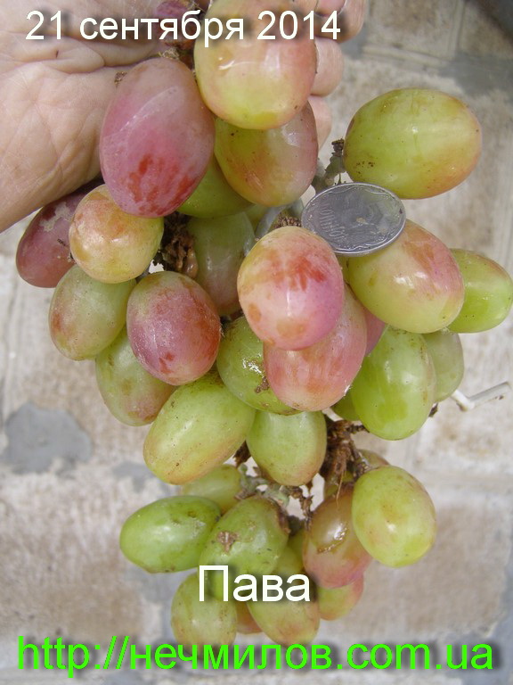 (Талисман х Андрюша) Побеги сильнорослые, молодые побеги гибкие. Цветок функционально женский, но опылляемость соцветий хорошая, пратически без горошения. Гроздь крупная, конической формы, средней плотности, весом 0,7-0,9 кг., очень красивая. Ягоды овальные, розово-красные, крупные,35х31 мм. Мякоть мясисто-сочная, гармоничного вкуса. Кожица тонкая при еде не ощущается. Гибридная форма высокоурожайная. Вызревание побегов хорошее. Лист средних размеров, пятилопастный, средней рассеченности, темно-зеленый. Листовая пластинка шаргеневая, ровная, нижняя сторона без опушения. Черешковая выемка открыта. Обрезка лоз на плодоношение 8-10 глазков. Нагрузка куста при обрезке 35-40 глазков. Морозоустойчивость -24С. Устойчивость к грибным болезням 2-2,5б.