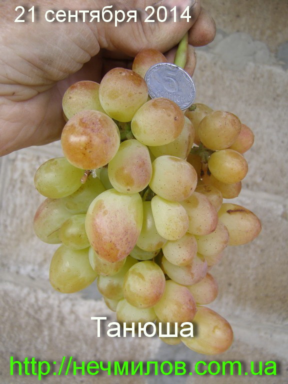2012 год. 2012 год пропущен, нынешний ничем не лучше тех лет, имеющих урожай на Танюше. Всего несколько гроздей и, как и ранее, завязавшиеся на лозах на концах плодовых стрелок. Увы, в начале, на первых почках полное их отсутствие. Явный каприз формы на этот счет и здесь ничего не поделаешь. В остальном, по товарности к данной формы претензий нет, ягода крупная, продолговатая, бело-розовая, с плотной мякотью, с хорошим вкусом, с не ощущающейся при еде шкуркой. Грозди до килограмма с полным отсутствием горошения, при однозначно женским типом цветке. Явно для Танюши надо применять арочную или другую подобную формировку с возможностью осуществить длинную до 20-ти почек обрезку лозы. В моих условиях, при веерной формировке, такое невозможно. Срезано 17 сентября.